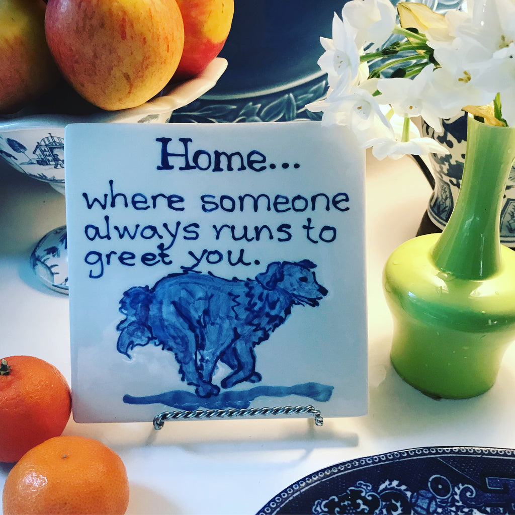 Hand painted blue and white trivet with a golden retriever running to meet its master. May be used for display and/or hot pots, casseroles, and dishes. A perfect hostess gift!