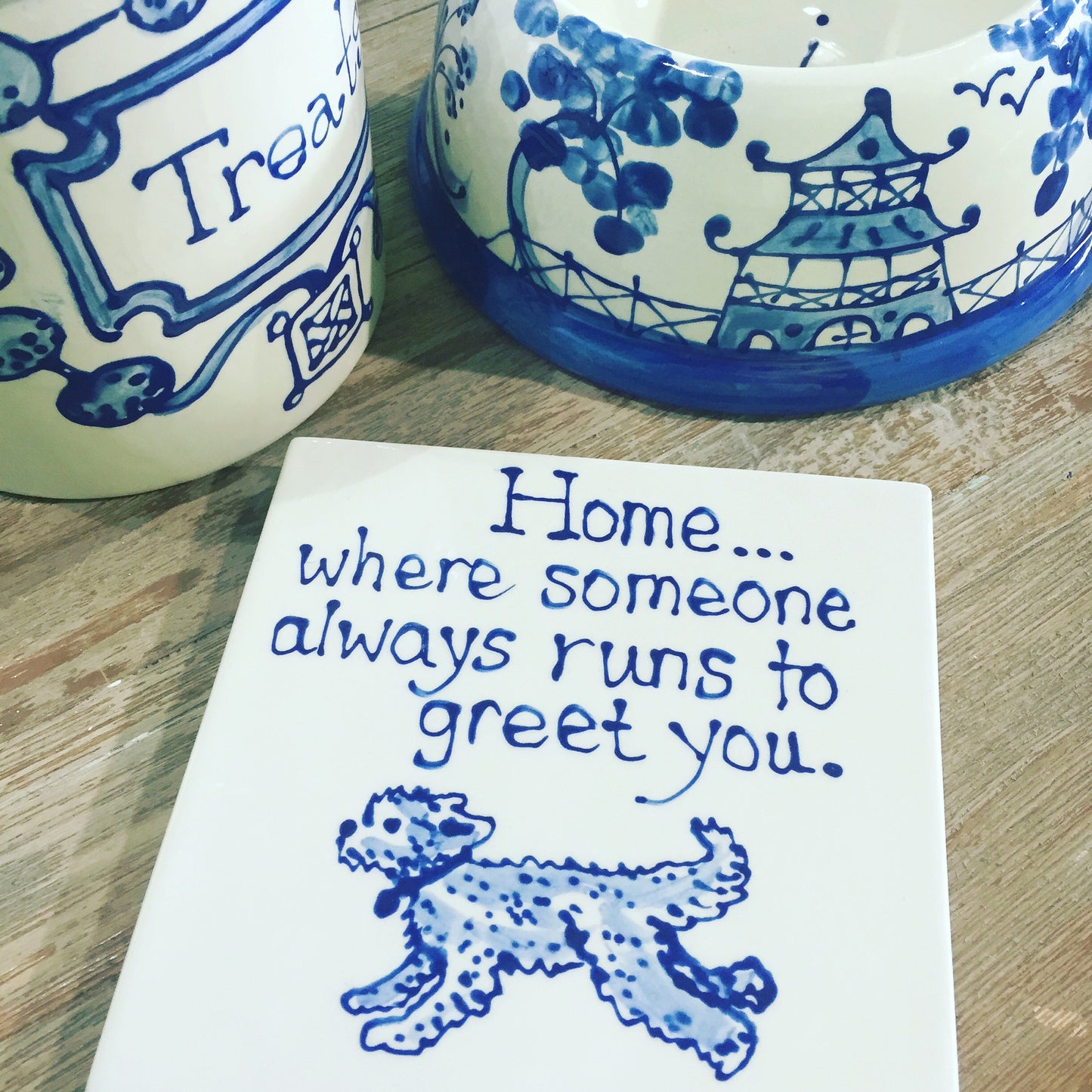 Trivet/plaque with a Goldendoodle illustrated in blue. This 6 x 6” ceramic tile is a perfect gift for the Doodle lover.